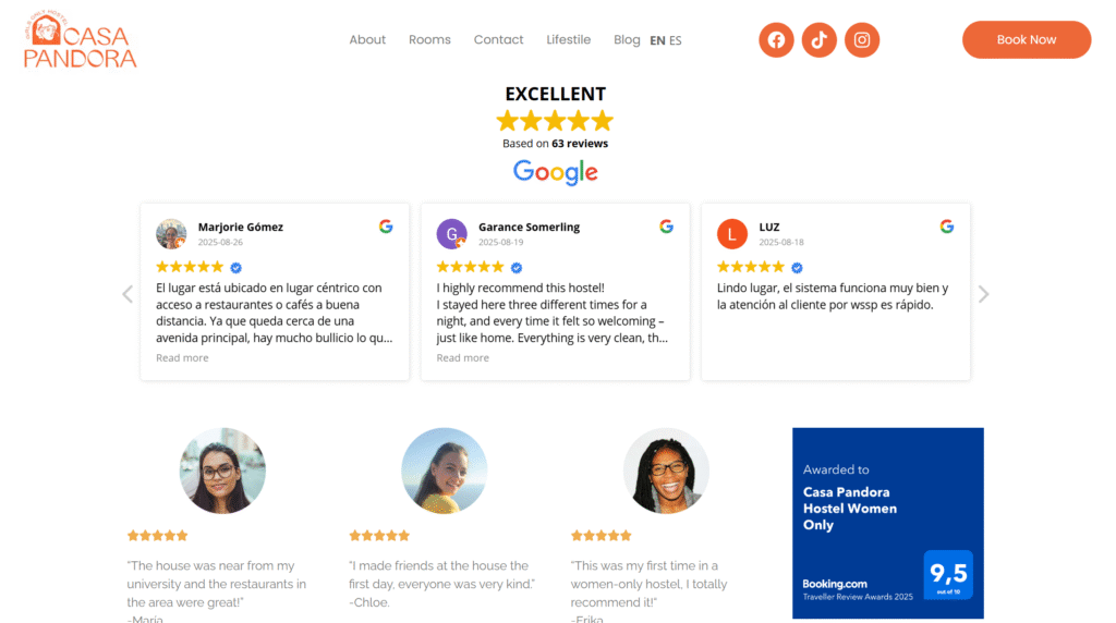 Hostal Casa Pandora es un hostel especializado en hospedaje exclusivo para mujeres. Se creó un sitio web a la medida de las necesidades del negocio, conectando las reseñas de Google My Business, la página de Booking y la estrategia SEO.